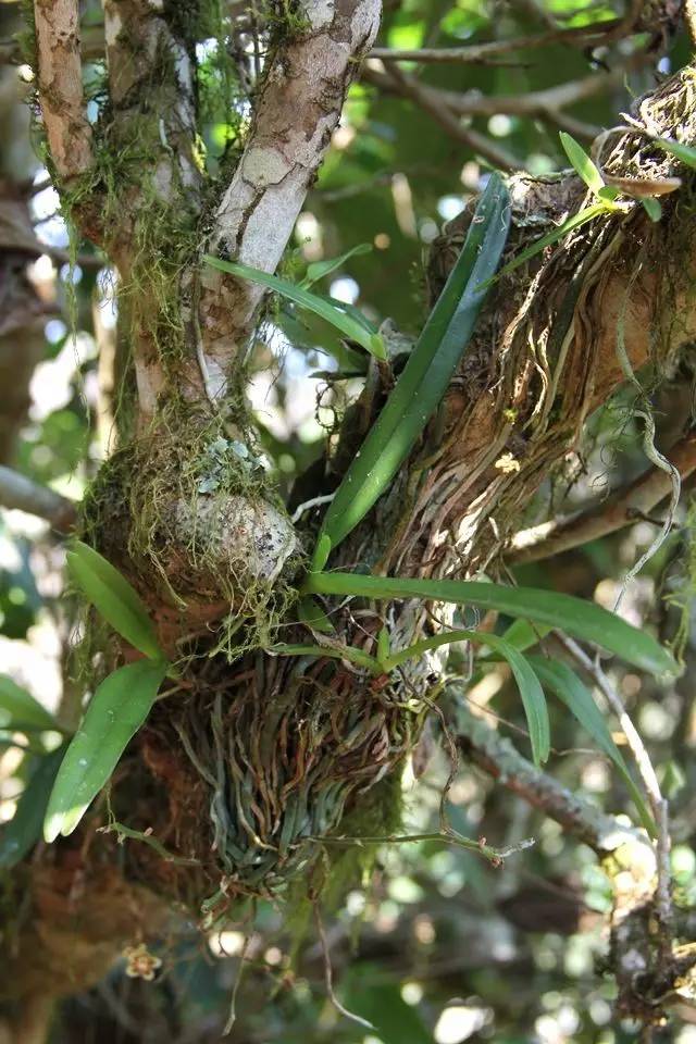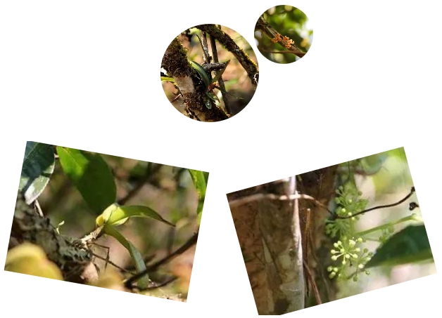 古茶树上各种各样的寄生植物,诉说着它的故事与沧桑。有苔藓类的植物、兰科植物(各种不知名的兰花、石斛等)、还有一些不认识的植物寄生在茶树上。