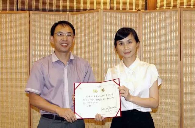 广州市总工会职业技术学校常务副校长肖汉文(左)向苏曼老师(右)颁发聘书