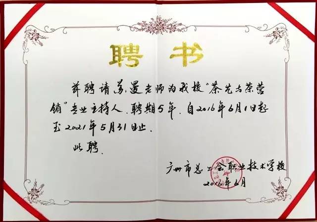 苏曼老师的“茶艺与茶营销专业”专业主持人聘书