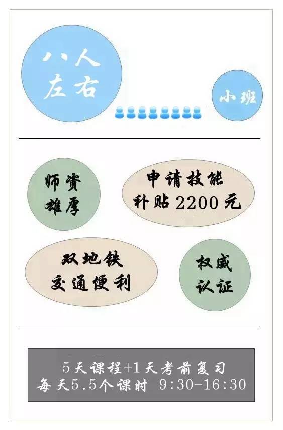 教学特色:雄厚的师资、小班教学、权威认证、符合国家规定条件者考证通过可持证申请技能补贴2200元。