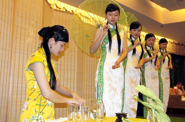 表演主题:“撑着油纸伞,独自彷徨在悠长、悠长而又寂寥的雨巷,我希望逢着一个丁香一样的结着愁怨的姑娘……”一首《雨巷》将人们带进如梦的江南。茶艺姑娘优雅的茶艺与柔美的舞蹈,体现了江南与茶的自然之美,从中去感悟“品茶即品人”的人生哲理。
