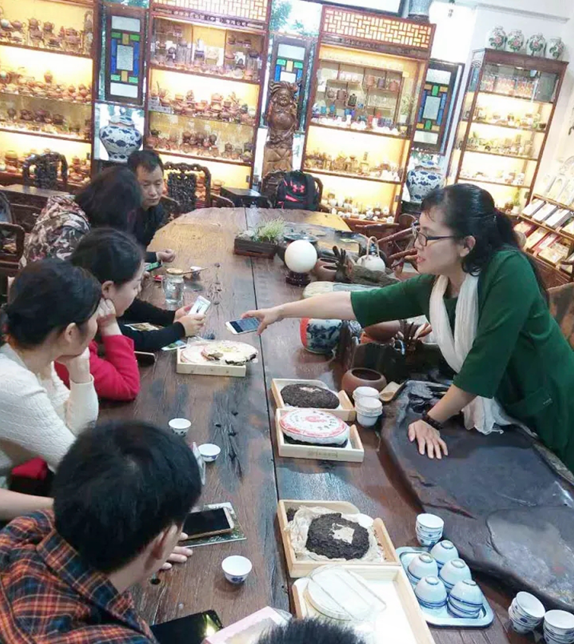 这一天课程的上课地点是陈国璋茶文化馆,文化馆中储存着大量陈茶,老师对照实物样为大家讲解茶叶储存的知识、茶叶包装设计和文字标准。