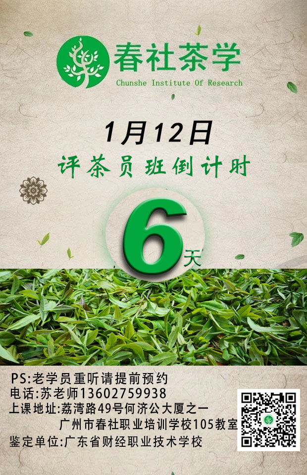 广州春社茶学将于2019年1月12日如期在新校区举办第一期培训啦(评茶员职业资格四级、三级培训)!感谢新老学员一如既往的信任与踊跃支持,本期培训班已满员并截止招生!下期培训预计将在2月底举行,评茶员及茶艺师一、二级培训将于三月份开始接受报名,四月中下旬上课。欢迎咨询,敬请期待!