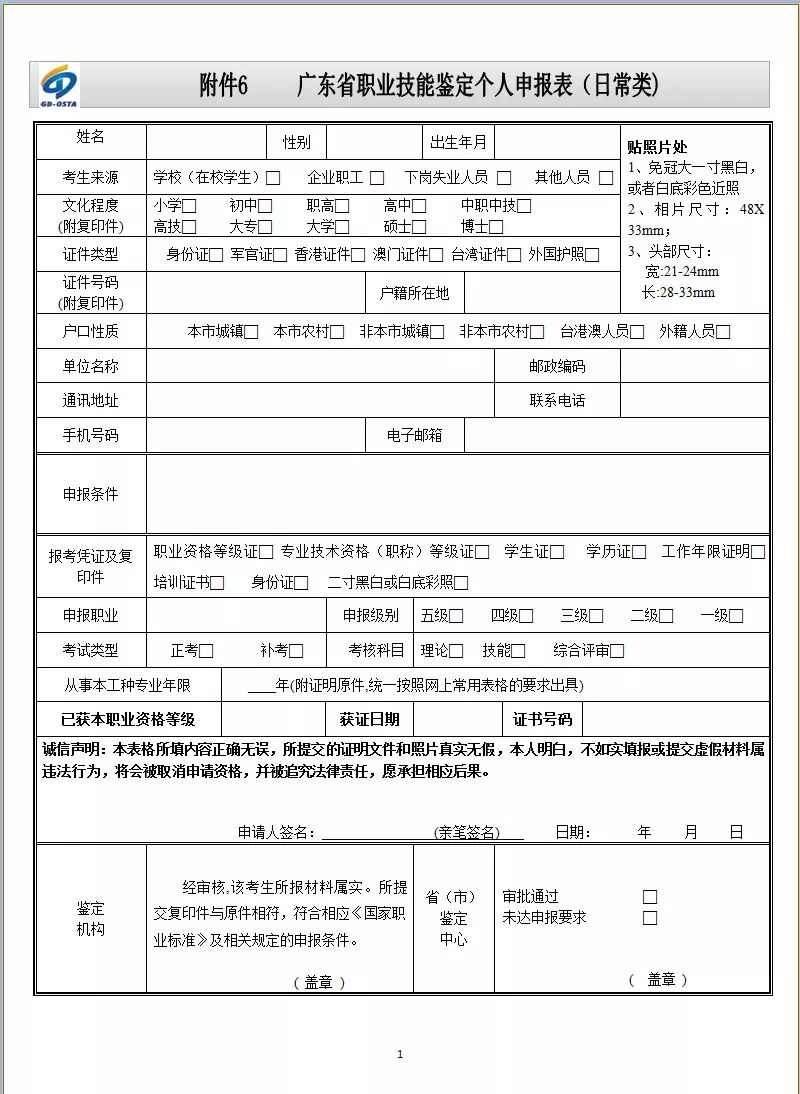 (1)广东省职业技能鉴定个人申报表