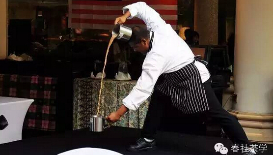 拉茶主要成分是红茶茶汤和炼乳,关键技术是“拉”。利用两个杯子拉来拉去,拉得越高、次数越多,起泡越多,味道就越好。