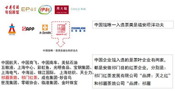米兰世博会入选门槛很高,并不是花钱就能进入。入选赞助企业实力雄厚,拥有相当的品牌影响力,而且每一类别都有排他性,这次入选的指定茶是公共品牌”福安坦洋工夫”和企业品牌“天之红”、“祁眉”祁门红茶,作为传统中国茶走入欧洲,展示国家文化实力。