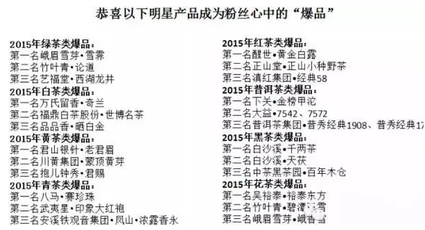 依照结果,中国茶产业观察将每类茶投票结果排在前3位的产品,称之为“爆品”,即互联网时代下的“线上有口碑、线下有渠道”产品。