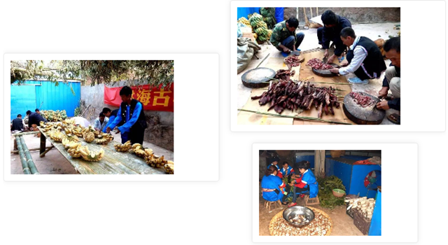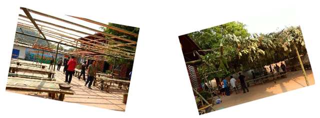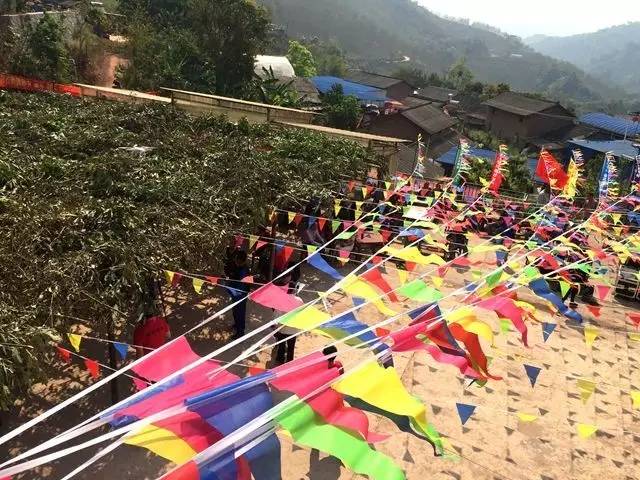 为了迎接这个重大的节日,背阴山寨子里的人一早就开始准备了起来:他们在院子里用竹子搭好长竹桌、竹凳,并贴心地搭好竹棚、盖上树枝,为到来的客人遮挡烈日;还有一部分人则在准备中午长桌饭的食材。