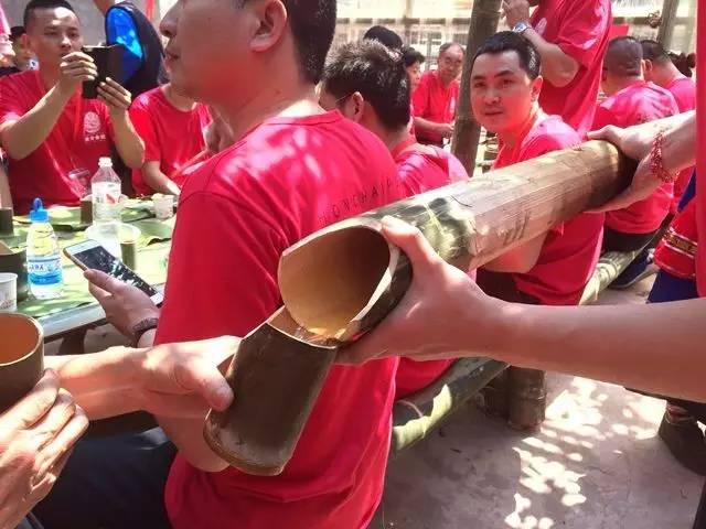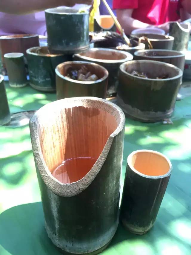 喝茶饮酒的盛具也都是用竹子做的,大杯喝茶、小杯饮酒。喝茶的竹杯有点大,为了让客人喝茶时不至于碰到鼻子,还特意将竹杯的一边削出一个缺口。